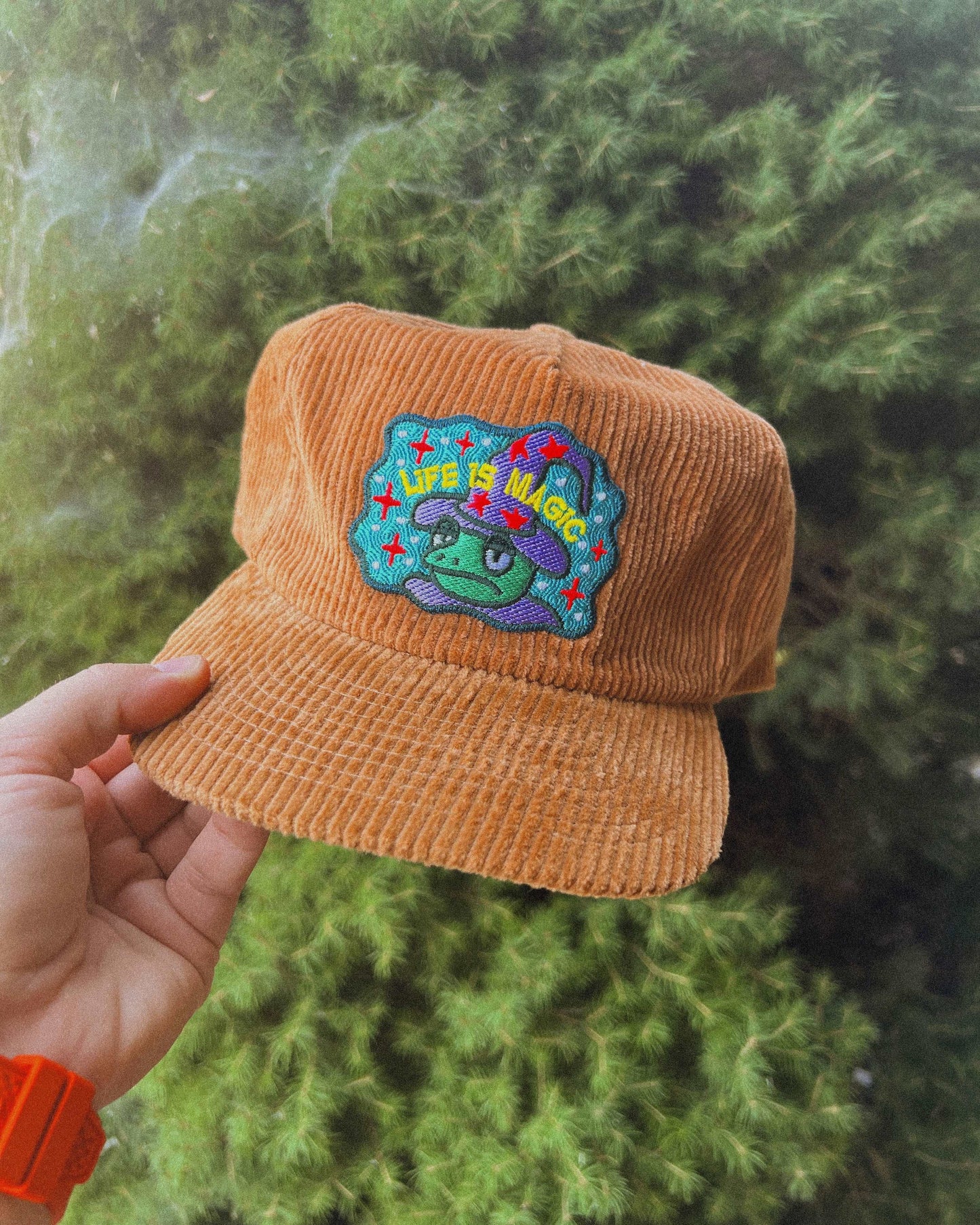 Embrace the enchantment of life with our Life is Magic Corduroy Hat. This thoughtfully designed cap features an embroidered patch depicting a wise-looking frog surrounded by stars, symbolizing the magic and wonder that can be found in everyday life, even if he is a little grumpy.