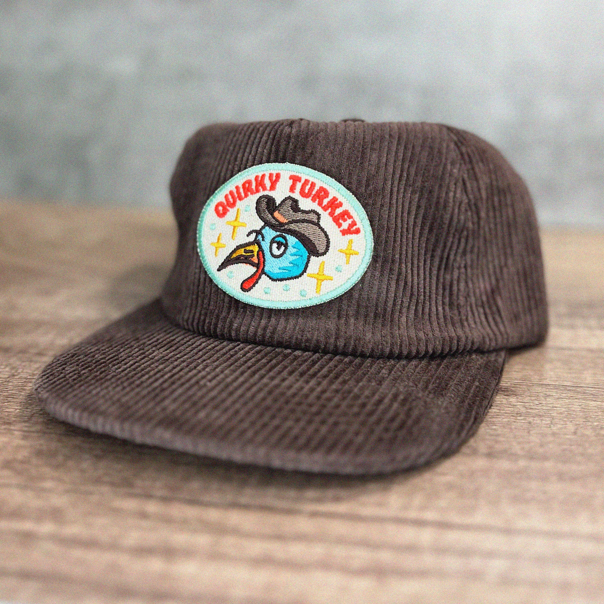 A super cute corduroy hat for all you quirky turkeys out there!! Featuring a quirky cowboy turkey and fun, vibrant colors on a patch that is then machine embroidered onto the hat itself. This creates a durable and lasting finish. This is a hat that you can enjoy for a lifetime!