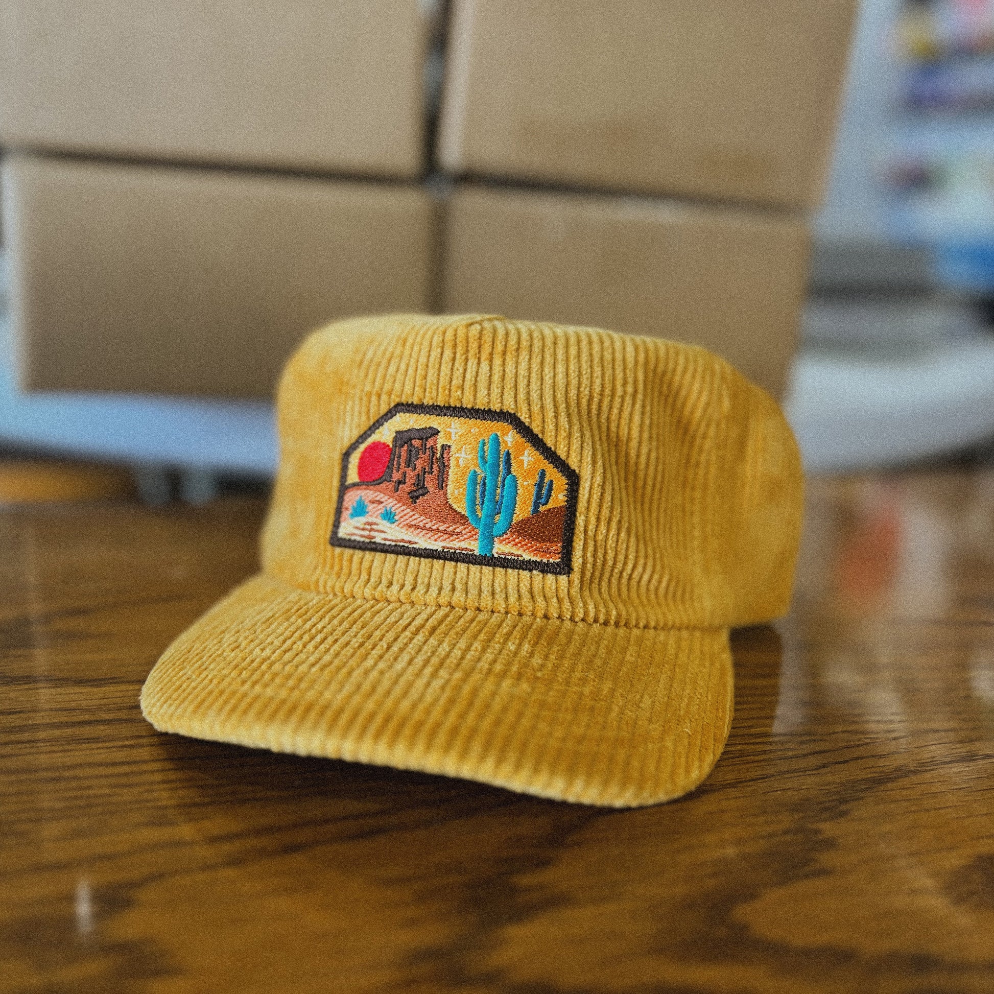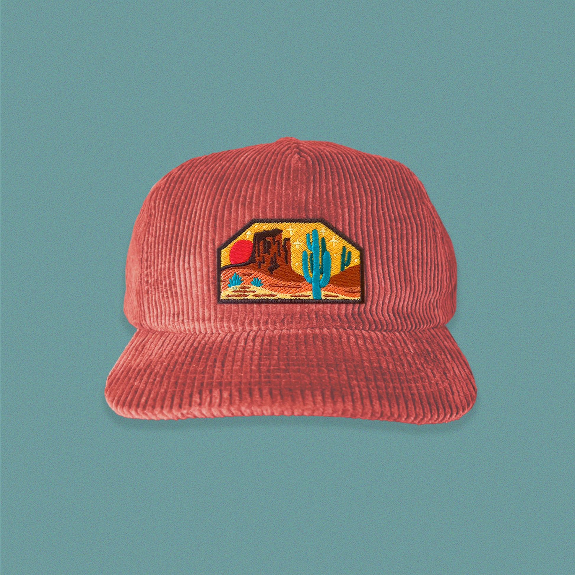 I've always had a love of the desert and cactus and I wanted to create a patch and hat that epitomized the beauty of it. This hat is made personally by me. I start by embroidering the patch, then machine sewing it onto a corduroy hat.